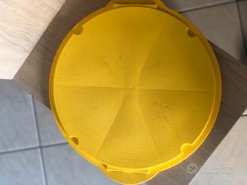 Porta torta con coperchio in plastica. Colore giallo, apertura a scatto. Misura diametro 30 cm Usato, alcuni segni di usura sul piatto (vedere foto).