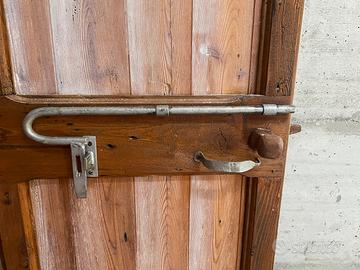 Porta tradizionale stalla o fienile con catenaccio. La porta misura 202 * 75 cm con il telaio (visibile in foto) puo coprire un vano di circa una quindicina dl cm per lato piu ampia. Utilizzabile anche per arredo (tavolo/testata letto). Ritiro in loco a cura dell’acquirente.