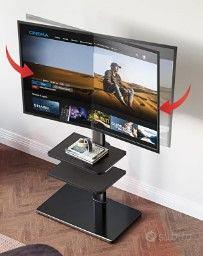 Supporto TV da pavimento inclinabile, girevole e regolabile per TV 32-70 Pollici. Struttura in acciaio nero con 2 mensole in vetro temperato nero e morsetti ferma-cavi. Fori per nascondere i cavi