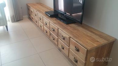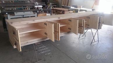Porta tv in legno di abete vecchio recuperato da antichi solai con misura lungh. 300 prof. 45 h 50 composto da 8 ante a 4 vani uguali con ripiano interno aggiustabile in altezza in abete con apertura su cerniere da cucina regolabili con 2 frontali applicati su ogni anta con apposita maniglia a finestrella. Zoccolo con h 5 cm dritto schienale rientrante per alloggiare i fili, tutto a vista in pattina originale che il tempo ha fatto spazzolato e levigato in modo che risulti morbido al tatto. Piedini livellatori per mettere a bolla, Finitura con cera naturale trasparente. Compreso finitura Iva non comprendente, costruito su commissione, non disponibile a magazzino ma possiamo riprodurlo DIRETTAMENTE DAL PRODUTTORE ASTENERSI RIVENDITORI O COMMERCIANTI