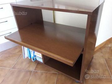 Porta Tv in noce massello con rotelle Dotato di 4 scomparti di cui: 1 carrello porta videoregistratore estraibile Un porta Cd e 2 piani Jolly come da foto Misure : L. 82 P. 52 H 78 zona di vendita GRUMO NEVANO ( NA)