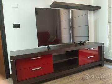 Porta TV moderno con mensole e cassetti in vetro rosso