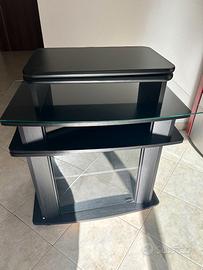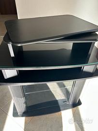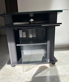 Mobile Porta TV Colore Nero con Piano Girevole. Dispone di Ruote per un facile spostamento. Struttura con Ripiano e sottostante vano con anta in vetro. Era stato realizzato un top in vetro a misura per preservare la superficie.