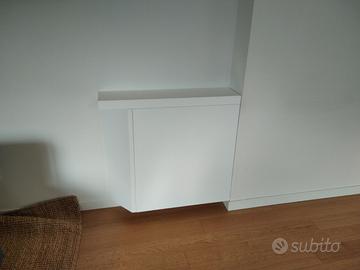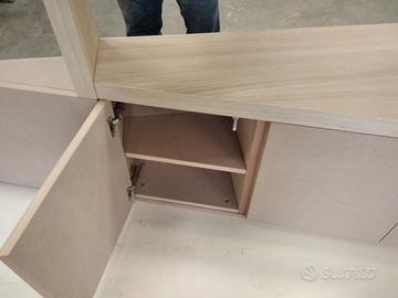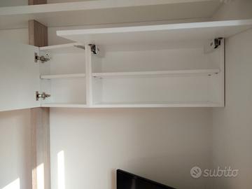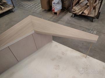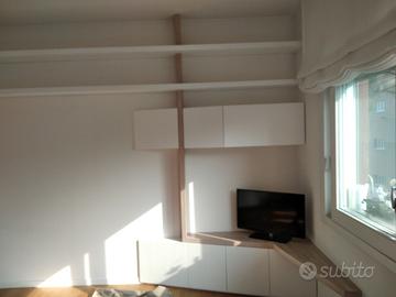 Porta tv angolare costruita in listellare ricoperto di mdf (idoneo per essere laccato uniformemente e la laccatura sia omogena e non crei problemi nel tempo) con mensole sospese con lunghezza 370 circa spessore 5 cm tutto la struttura per quanto riguarda le mensole con profondità 30 cm in orizzontale. Pensili superiore sospesi con misura lunghezza totale circa 180 in cui i 1° pensile spizzato a punta 1 pensile da 17 prof. a 30 con un'anta e il restante con 2 ante che si apriranno su cerniere con sistema push pull a pressione e h 43 cm. Montante da 5 cm verticale prof. 17 h fino a soffitto circa 270 in listellare di rovere come pure la mensola angolata 125 x 146 verso la punta. Sotto troveremo 3 basi stessa fattezza di quelli superiori con ripiano interno aggiustabile in altezza (1 vano piccolo a punta chiuso) 01 cubotto con misura lungh. circa 68 h 33 con mensola inclinata e scavata a giorno prof. 30 circa. 01 vano ripostiglio misura lungh. 80 h 67 prof. 19 con vano apribile parte superiore sempre a push pull laccato uniformemente rall da definire 9010. Verranno predisposte baionette nascoste regolabili con fischer idonei lunghi (dovendo fare un foro per vedere isolamento quanti cm sono per regolarsi con i calcoli ed essere sicuri della stabilità del tutto). Finitura sbiancato su rovere e laccato rall 9010 per il restante. completo di finitura franco fabbrica non comprendente di iva. il mobile è stato prodotto e realizzato per un cliente su proprie specifiche e venduto non teniamo magazzino di conseguenza lo possiamo costruire uguale o modificando misure e fattezza come uno desidera, da noi diretti produttori e costruttori puoi realizzare mobili esclusivamente su misura, per dubbi e chiarimenti contattateci. ASTENERSI RIVENDITORI E COMMERCIANTI