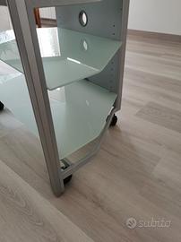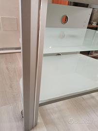 Svendo un porta tv in alluminio e cristallo. 3 ripiani tutti in cristallo pregiato. Largo 86 cm davanti, 52cm dietro. Altezza cm 64 Con rotelle.