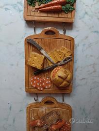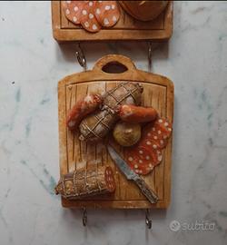 Hanno il gancio per attaccare utensili da cucina, fanno arredo perché ciascuno ha disegnato salumi, verdura e formaggi, unici nel loro genere fatti in ceramica a mano