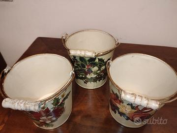 Set 3 porta vasi vintage in metallo smaltato con applicazione di decori a fiori in carta. Colore di fondo panna con rifiniture oro. Buone condizioni generali, solo uno dei vasi reca segni di urto, il prezzo ne tiene conto. Altezza 14, larghezza 13,5-11