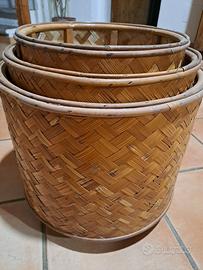 Portavasi, portafiori, fioriere in vimini e bambu con rotelle.