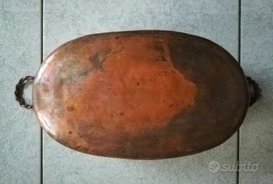 Porta vaso contenitore in rame: lavorato a mano, lunghezza cm 37 oltre ai manici, larghezza cm 24,5, altezza cm 16, peso kg 2