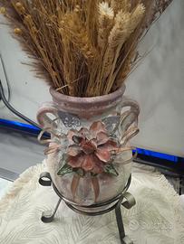 porta vaso in ferro battuto e vaso fatto a mano con bellissima lavorazione floreale sempre in ferro
