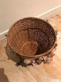 Cesta portavaso in vimini e ferro battuto con decorazioni floreali.