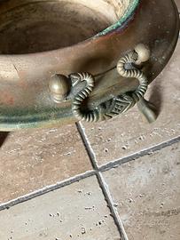 Porta vaso /pianta in ottone con struttura a 3 piedi e 2 maniglie .Diametro 44 cm Necessita di un intervento di pulizia per riportarlo più lucido