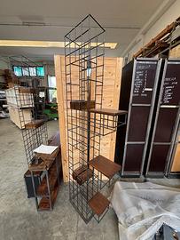 Porta vino in ferro con mensole in legno di abete verniciato, può contenere fino a 80 bottiglie. 22x71 h. 232