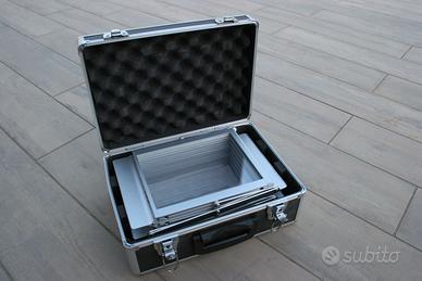 Vendo porta flyer da terra in alluminio a mensole inclinate di formato A5 color argento. Dispone di 6 scomparti e valigia rigida con chiusura a chiave.