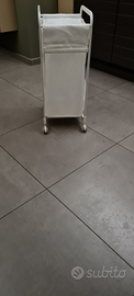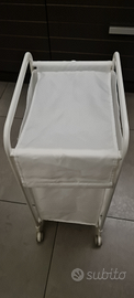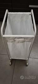 Portabiancheria con rotelle. Dimensioni: 40x30 cm, altezza 75 cm. Completamente sfoderabile e lavabile. Bianco latte.