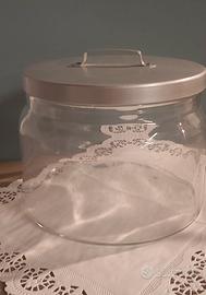 vetro e alluminio. dimensioni: diametro 20cm altezza 16 cm; guarnizione perfetta, la plastica interna si è crepata, come da foto. Non compromette l'apertura e chiusura del contenitore. le condizioni sono ottime ma tappo interno purtroppo crepato.