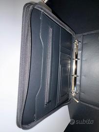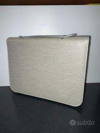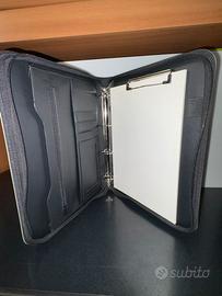 Portablocco ad anelli con tasche laterali e cerniera , diventa una pratica cartella con maniglia per portarla . Materiale esterno raffinato in tessuto . Cerniera di chiusura perfetta. Usato pochissimo . Misure 26 cm.x34 cm x 3 cm