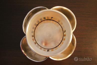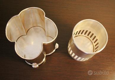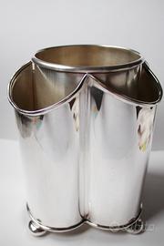 Portabotiglia in Sheffield placcato argento di forma molto particolare composta di due pezzi. Altezza- 20 cm., diametro 16,5 cm.
