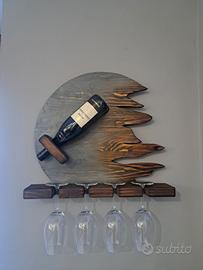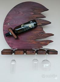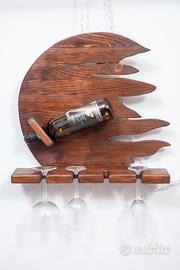 La bottiglia viene sospesa in equilibrio, diventando protagonista, mentre la base inferiore ospita elegantemente i calici, trasformando la parete in un vero angolo degustazione artistico.