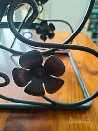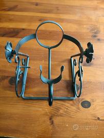 Portabottiglie in ferro battuto, dal design elegante e decorativo. Struttura solida in metallo verniciato nero, arricchita da motivi floreali e linee curve che richiamano uno stile classico con un tocco romantico.
