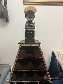 • Decorazione: Sulla sommità è posizionata una statuetta tribale in legno scuro, raffigurante una figura umana con i capelli chiari e fibrosi. in buone condizioni veramente