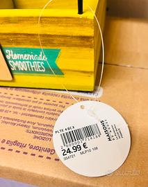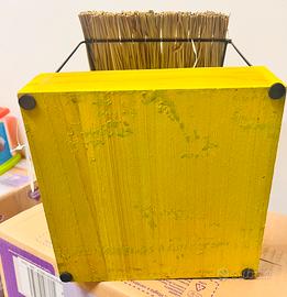 Portabottiglie o espositore decorativo di Maisons du Monde, caratterizzato da una struttura in legno giallo con scomparti e un tetto in paglia. Base: 20x20cm Articolo con cartellino originale, mai utilizzato. Valore: 24,99€