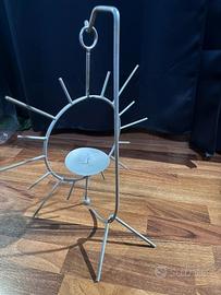 Portacandela in metallo dal design originale e decorativo, ideale per arredare ambienti interni o spazi esterni come balcone e terrazzo. Stile industrial/vintage, perfetto come elemento d’arredo creativo.