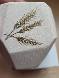 L'oggetto si distingue per la sua linea geometrica moderna e per il raffinato decoro dorato a forma di spiga, simbolo ideale per celebrare momenti importanti come la Prima Comunione o la Cresima.