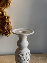 Elegante portacandela in ceramica bianca lucida, con lavorazione traforata.