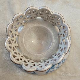 Portacandele in ceramica. "Ceramiche Val Demone", un tipo di produzione artigianale tipica di Santo Stefano di Camastra, in Sicilia. Caratteristiche:La parte inferiore è una ciotola con smalto craquelé e decorazioni blu dipinte a mano.La parte superiore è un elemento traforato, simile a un cestino o a una corona, che potrebbe servire a sostenere una candela o come elemento decorativo.