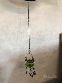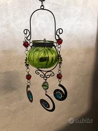 Bellissimo portacandela sospeso in vetro soffiato verde montato su struttura in metallo lavorato.