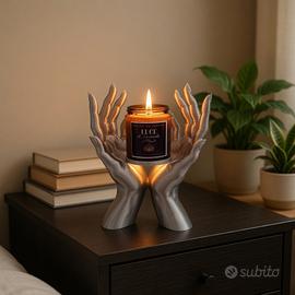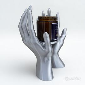Portacandela realizzato con mani stampate in 3D finitura metallizzata argento. Perfetto per creare un’atmosfera rilassante e di design in camera da letto, soggiorno o sala meditazione. Dettagli: • Dimensioni compatte ma stabili, circa 19cm di altezza • Design unico e originale • Finitura metallizzata Ideale come regalo di compleanno, per chi ama il benessere e l’arredamento originale. Utilizzabile anche senza candela, come svuota tasche, o come supporto a piantine di piccole dimensioni. Prezzo: 32€ Spedizione possibile o ritiro a mano (zona Bologna)