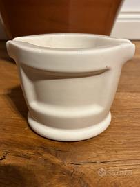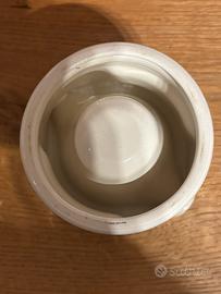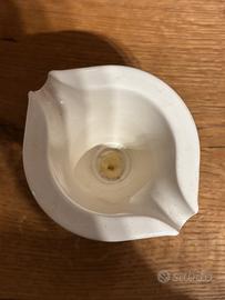 Elegante porta candela in ceramica bianca con logo dorato.