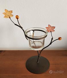 Portacandela Porta lumino Tealight Struttura in metallo Porta lumino in vetro Decorazioni foglie autunnali color ambra Dimensioni: 18 x 8,5 cm H. 19 cm