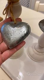 2 portacandele da tavola. Stile shabby chic in legno bianche decapate. Con ciondolo a cuore in latta