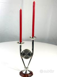 Elegante portacandele vintage con orologio integrato, in metallo cromato e base in legno lucido. Un pezzo d’arredo raffinato che unisce funzionalità e design retrò. Perfetto per dare un tocco caldo e sofisticato a una credenza, un camino o un angolo lettura. Altezza totale (con candele): 30 cm Condizioni: Nuovo confezione originale, funzionante. Incluso: 2 candele rosse per un effetto scenico immediato. Spedizione accurata e imballo protetto.
