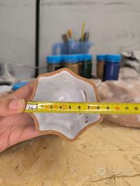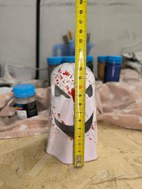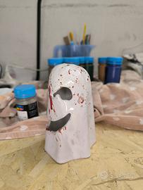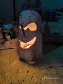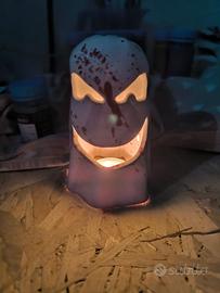 Per realizzare questo portacandele ho modellato un fantasma usando dell'argilla bianca, poi quando l'argilla lo permetteva, ho inciso la faccia. Dopo la prima cottura l'ho smaltato con del bianco e del rosso e cotto per la seconda volta.
