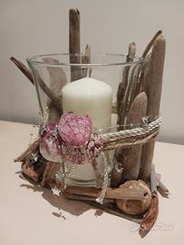 portacandele in campana di veyro e legni di mare + conchiglie rosa. pezzo unico