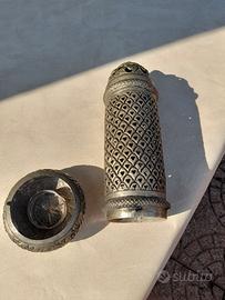 Portacandele presumibilmente mediorientale o nordafricano. Cesellato a mano. Altezza 25 cm.