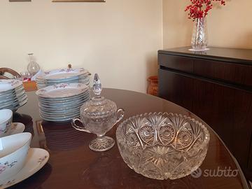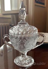 Ciotola con manici e coperchio in cristallo di Boemia, molto lavorata e pesante, stile vintage, si può utilizzare anche come salsiera o zuccheriera - vedi proporzioni nella foto con ciotola grande da macedonia. Ulteriore sconto con ritiro a mano!