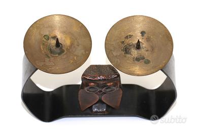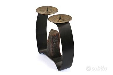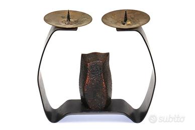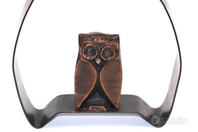 Portacandele "Gufo", realizzato a mano nel periodo di maggiore esplosione dell'Arts and Crafts in ferro battuto combinato con ottone e alluminio ramato. Il gufo è realizzato in modo espressivo, la base è in ferro battuto, le piastre per le candele sono in ottone, il gufo è in alluminio ramato. Altezza 20 cm, Larghezza 17 cm, Profondità 4,5 cm il solo gufo ha un'altezza 10 cm, larghezza 5,5 cm, profondità 3 cm, da ricerche effettuate in rete è stato prodotto in Germania tra 1890 - 1919, in ottime condizioni chiaramente usato con tracce di cera, valuto proposte serie, è prevista la spedizione.