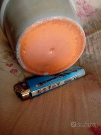 Candeliere candelabro portacandela di ferro battuto su vaso di terracotta o coccio pieno, pesantino. Altezza 36 e diametro max 10 cm, vedi anche accendino per confronto dimensioni. Usato tanto ma ancora in ottimo stato, ha solo il fiore un po' rovinato (ma si può togliere o sostituire facilmente) e va un attimo pulito da cera residua e polvere, ma veri difetti non ne ha.