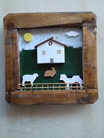Portachiave da parete porta presine 5 ganci in legno vecchio lavorato a mano,sia la struttura che gli animali ,casetta,sole,nuvola sono stati realizzati a mano.