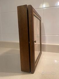 portachiavi a muro in legno massello tinta noce con filo oro stampa con fiori 5 ganci per chiavi con sportellino. misure 22x27x5