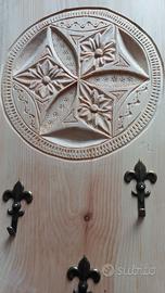 Portachiavi realizzato artigianalmente in legno di cirmolo (detto anche pino cembro), intagliato in stile floreale gotico, con 5 ganci color bronzo a forma di giglio. Dimensioni: cm 38 di altezza, cm 20 di larghezza e cm 3 di spessore.