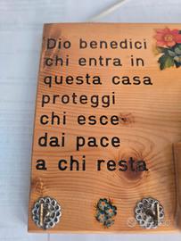 Portachiavi da muro con frase religiosa, che reca una preghiera di benedizione per la casa. La plachetta è realizzata in legno naturale, e decorata con elementi religiosi tridimensionali, tra cui un crocifisso sul lato destro,un'immagine ovale incastonata di un santo e un piccolo pozzo stilizzato con un secchiello metallico. Il testo inciso della preghiera recita una comune benedizione della casa. Immagini raffigurano Sant'Ignazio da Laconi "frate cappuccino sardo"