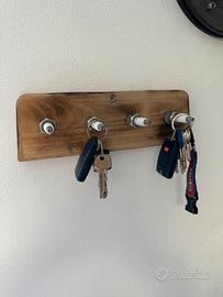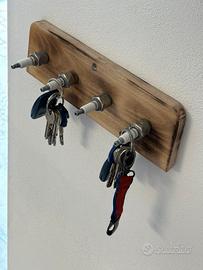 Originale portachiavi da parete realizzato a mano con una base in legno, dotato di 4 ganci portachiavi. Un accessorio perfetto per gli appassionati di motori o per chi ama l’arredamento dallo stile industriale e vintage.