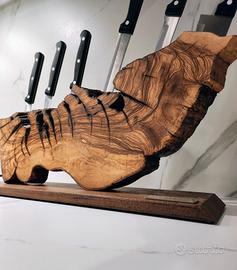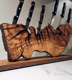 Portacoltelli magnetico realizzato con un antica radica di legno di ulivo italiano stagionato naturalmente e dalla forma che non può rimanere inosservata