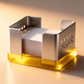 Un raccoglitore per gli indispensabili blocchetti memo, funzionale e dal design ricercato, caratterizzato dalla base quadrata e dai lati traforati. Color alluminio con fondo color giallo trasparente