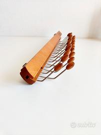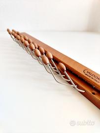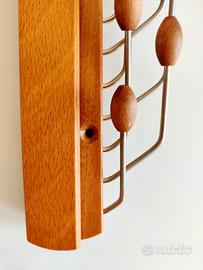 Elegante porta cravatte a parete firmato Valdomo, autentico Made in Italy. Realizzato in pregiato legno di frassino massiccio con finitura naturale e robusti ganci sagomati in metallo. Il suo design compatto e lineare è studiato principalmente per essere fissato all'interno dell'anta dell'armadio, permettendo un grande risparmio di spazio. È comunque perfetto anche per il fissaggio diretto a parete. Un pezzo vintage di qualità superiore, ideale per chi cerca ordine e stile. Capacità: 21 cravatte (organizzate su due file sfalsate). Doppio Uso: Progettato per interno anta armadio e per installazione a parete. Materiale: Vero legno di Frassino massello. Condizioni: Ottime condizioni vintage, legno lucido e struttura perfettamente integra. Montaggio: Facile fissaggio tramite due fori pre-esistenti.